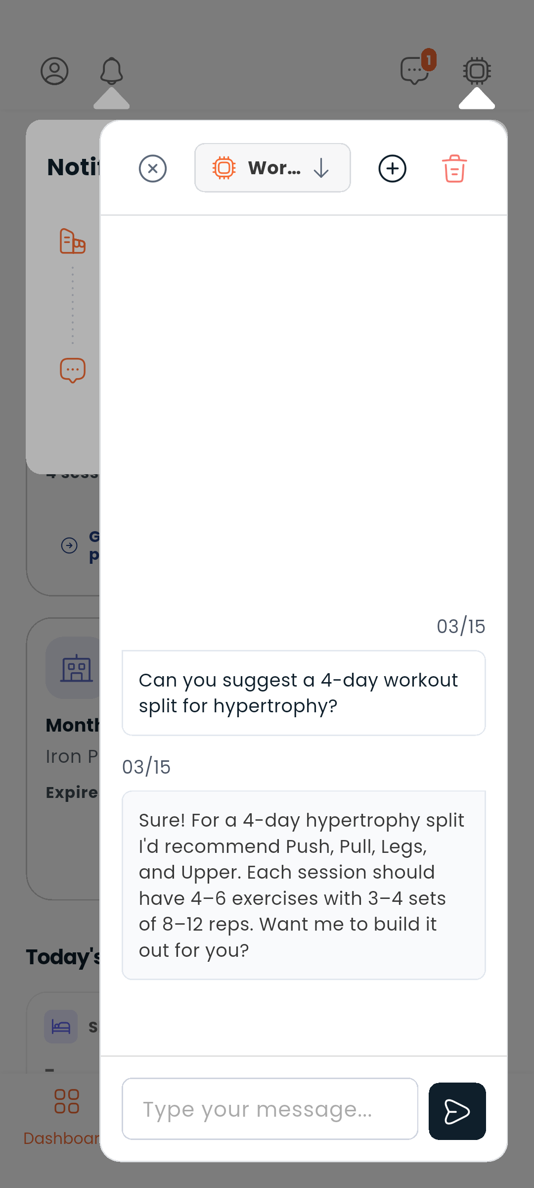 Look for the sparkle icon (✦) on any screen that supports it — workout plans, diet plans, profile, and more. Tap it to open a chat panel with the assistant.