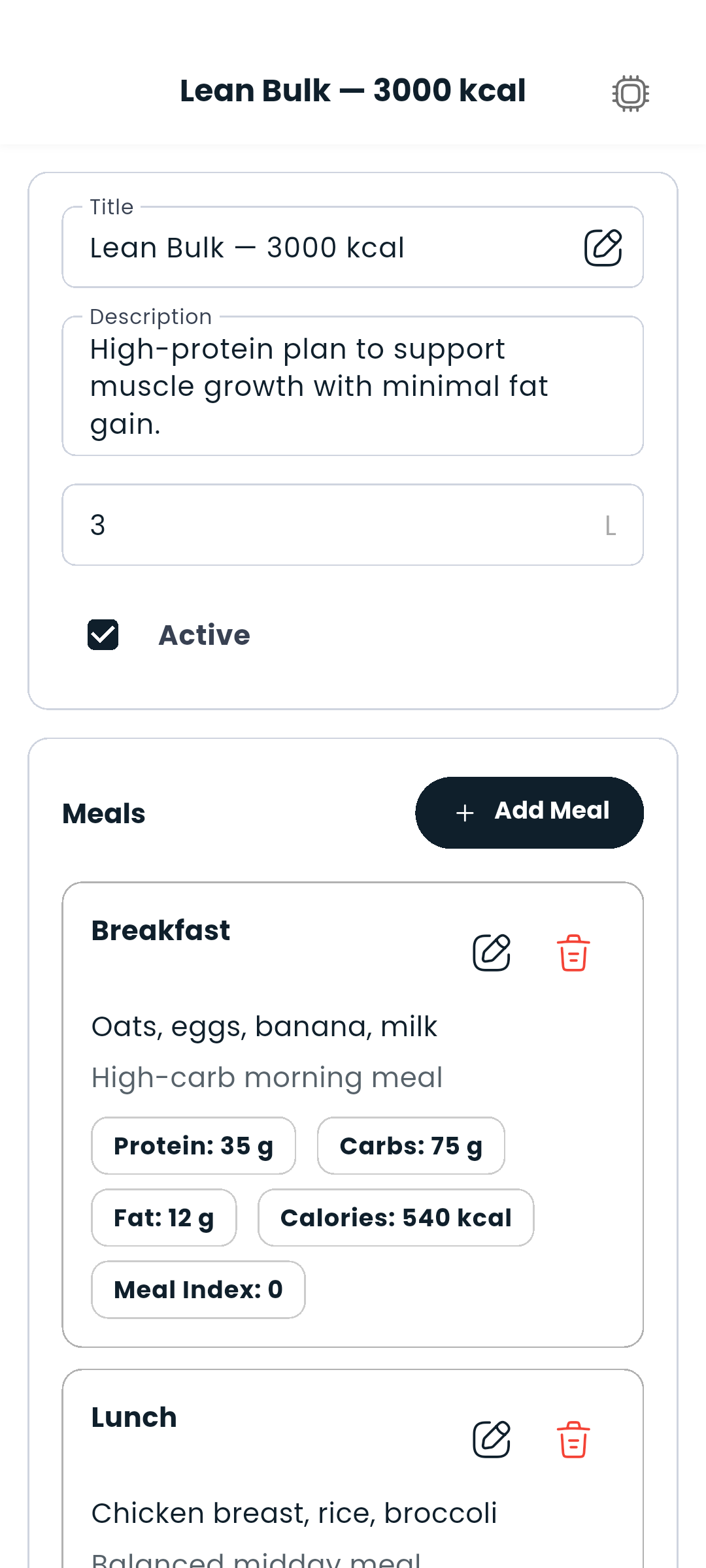 Each meal represents a distinct eating window in your day (breakfast, pre-workout, lunch, etc.).
