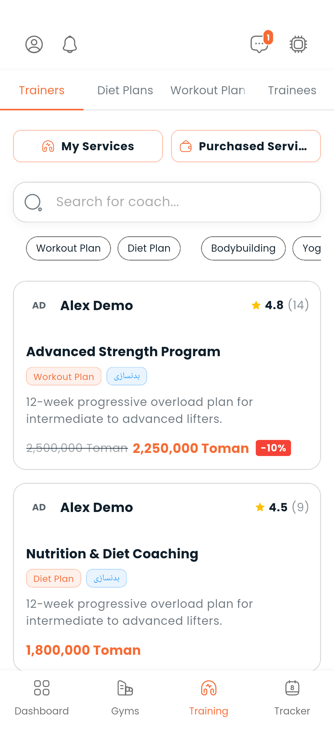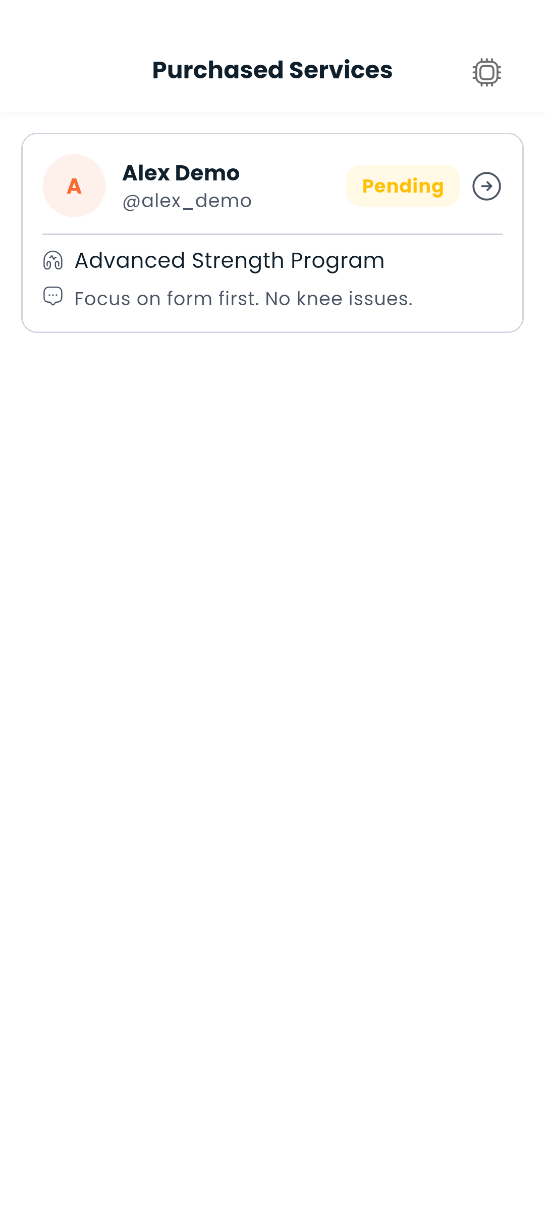 Go to Training → My Subscriptions to see all the services you're currently subscribed to. Tap any subscription to see details and communicate with your trainer.