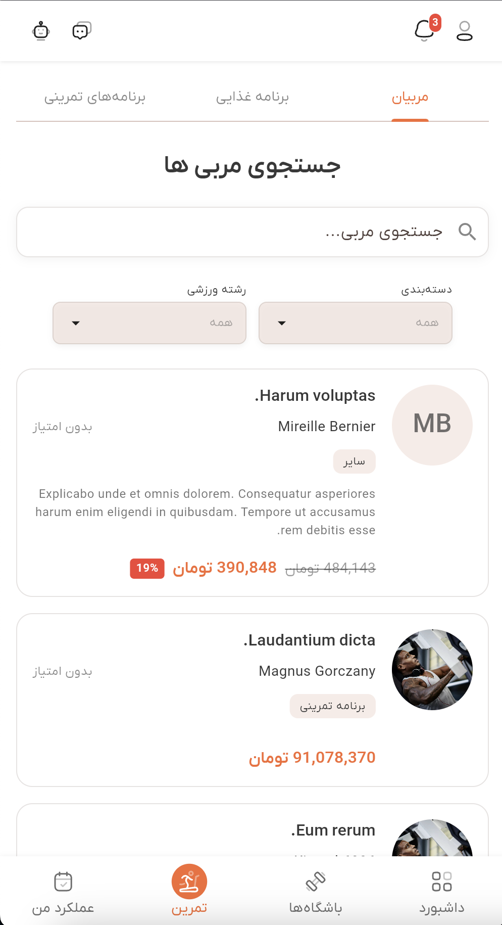 ویژگی جستجوی مربیان به شما کمک میکند متخصص تناسب اندام مناسب برای نیازهای خود را پیدا کنید. از جستجو و فیلترها به طور مؤثر استفاده کنید تا مربیانی را که با اهداف شما مطابقت دارند کشف کنید!